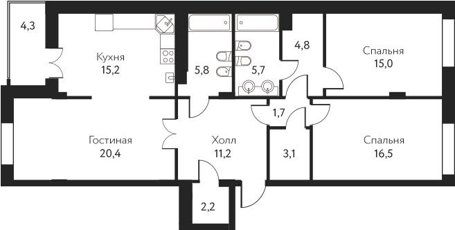 | Кухни S, м2: | 15.2 м2 |