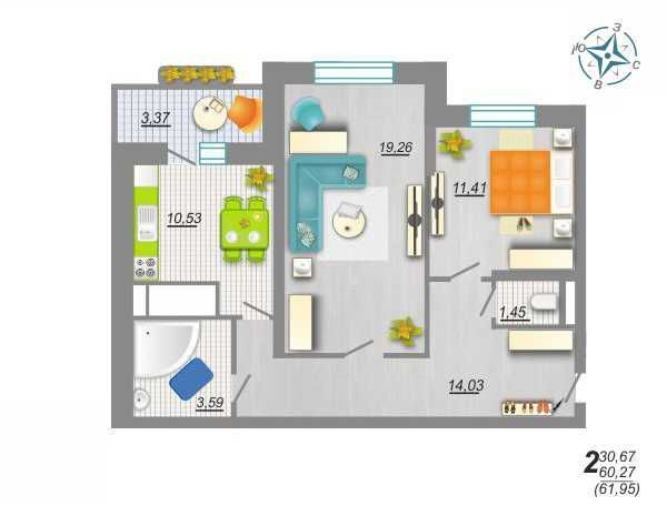 | Общая S, м2: | 61 / |